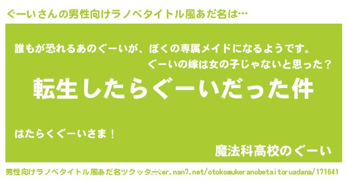 | 胡散臭い通販商品みたいなあだ名 | 『来世でも幸せになれる水素水…その名も「ぐーい」』 |