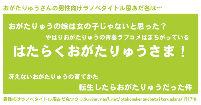 | 胡散臭い通販商品みたいなあだ名 | 『信頼と実績のサプリメント…その名も「おがたりゅう」』 |