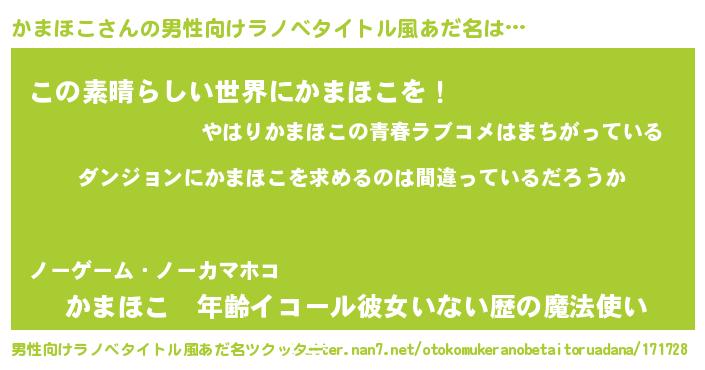 | 胡散臭い通販商品みたいなあだ名 | 『信頼と実績のサプリメント…その名も「かまほこ」』 |