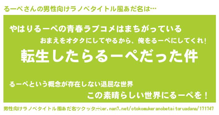 | 胡散臭い通販商品みたいなあだ名 | 『世界が平和になる高級そうな壺…その名も「るーぺ」』 |