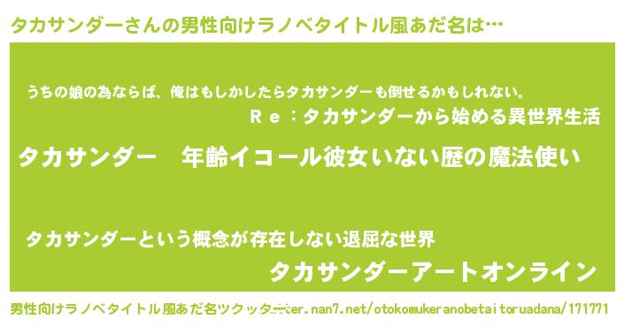 | 女子向けラノベタイトル風あだ名 | 『タカサンダーの玉の輿計画!』 |