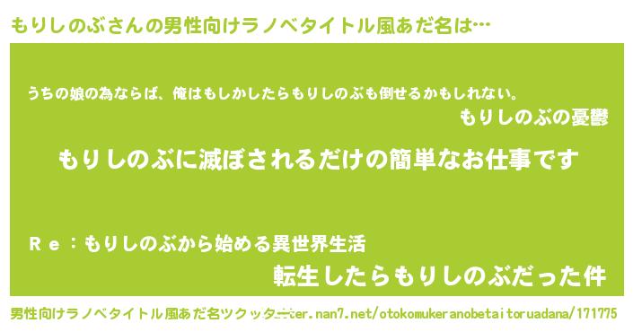 | 女子向けラノベタイトル風あだ名 | 『横柄もりしのぶと宰相陛下』 |