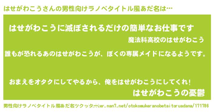 | 女子向けラノベタイトル風あだ名 | 『はせがわこうの契約王妃』 |