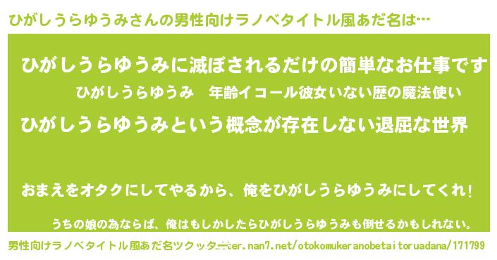 | 女子向けラノベタイトル風あだ名 | 『異世界で失敗しない100のひがしうらゆうみ』 |