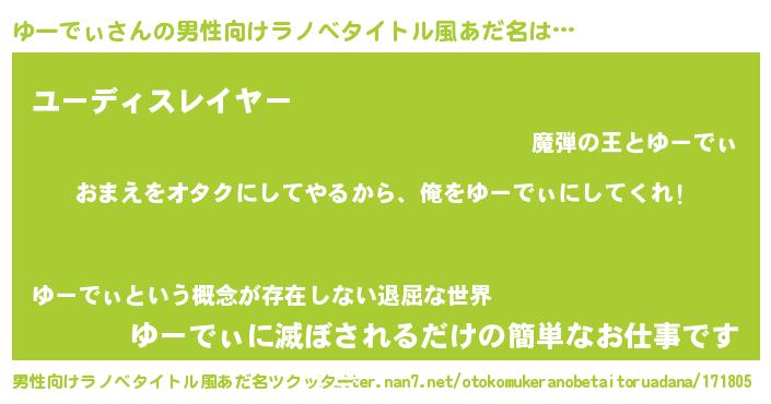 | 女子向けラノベタイトル風あだ名 | 『ゆーでぃ恋絵巻』『ゆーでぃの契約王妃』 |