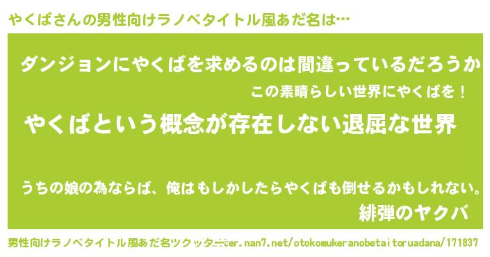 | 胡散臭い通販商品みたいなあだ名 | 『来世でも幸せになれる水素水…その名も「やくば」』 |