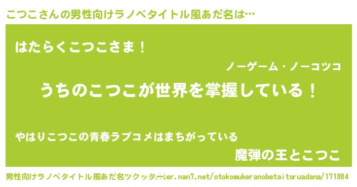 | 胡散臭い通販商品みたいなあだ名 | 『あなたにだけ特別に提供する100年もののヴィンテージワイン…その名も「こつこ」』 |
