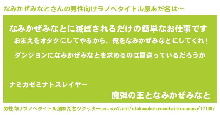 | 女子向けラノベタイトル風あだ名 | 『なみかぜみなとの卵を拾いまして』 |