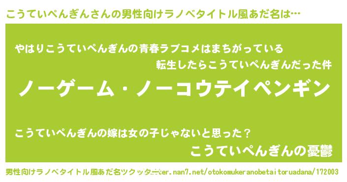 | 女子向けラノベタイトル風あだ名 | 『死神こうていぺんぎんの再婚』 |