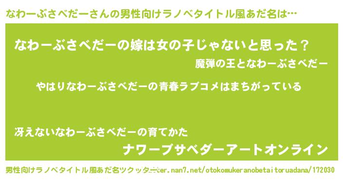 | 女子向けラノベタイトル風あだ名 | 『なわーぶさべだーの雑貨屋さん』 |