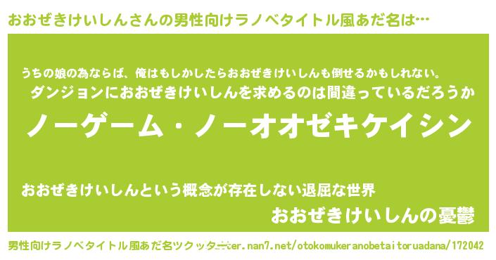 | 女子向けラノベタイトル風あだ名 | 『死神おおぜきけいしんの再婚』 |