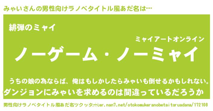| 女子向けラノベタイトル風あだ名 | 『死神みゃいの再婚』『みゃい伯爵の花嫁』 |