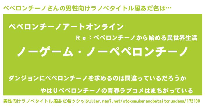 ペペロンチーノさんの男性向けラノベタイトル風あだ名をツクッター!