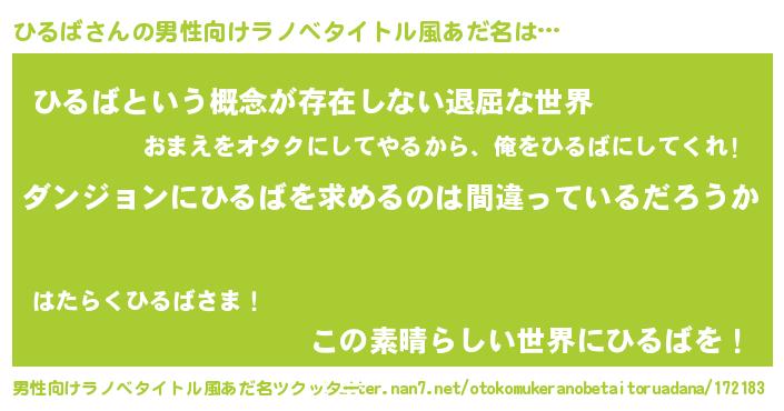 | 女子向けラノベタイトル風あだ名 | 『ひるばの卵を拾いまして』 |