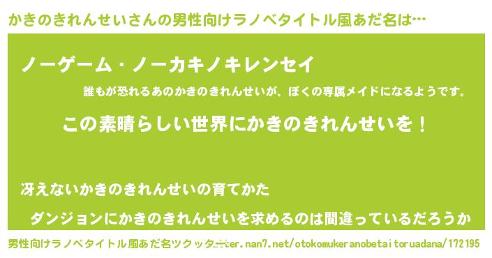 | 胡散臭い通販商品みたいなあだ名 | 『あなたにだけ特別に提供する100年もののヴィンテージワイン…その名も「かきのきれんせい」』 |