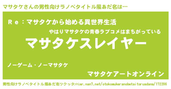 | 女子向けラノベタイトル風あだ名 | 『婚約破棄系悪役マサタケに転生したので、保身に走りました。』 |