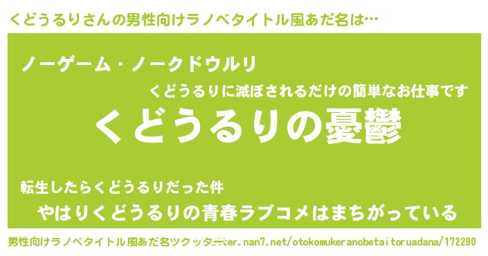 | 女子向けラノベタイトル風あだ名 | 『(仮)くどうるりのやんごとなき事情』 |