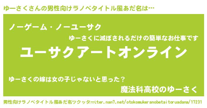 | 女子向けラノベタイトル風あだ名 | 『誰かこのゆーさくを説明してください! ~契約から始まるウェディング~』 |