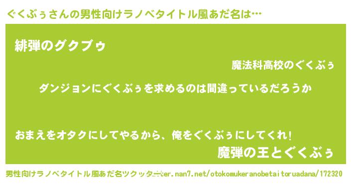 | 女子向けラノベタイトル風あだ名 | 『ぐくぶぅの卵を拾いまして』 |