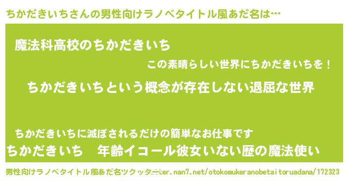 | 女子向けラノベタイトル風あだ名 | 『異世界で失敗しない100のちかだきいち』 |