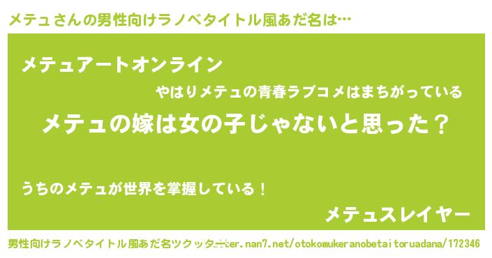 | 女子向けラノベタイトル風あだ名 | 『メテュ様がみてる』『メテュ伯爵の花嫁』 |