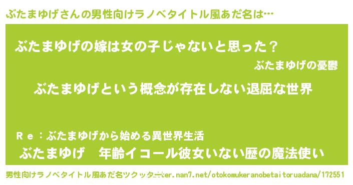 | 女子向けラノベタイトル風あだ名 | 『異世界で失敗しない100のぶたまゆげ』 |