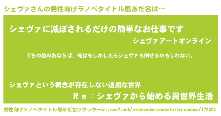 | 女子向けラノベタイトル風あだ名 | 『シェヴァの婚約者』『闇のシェヴァ』 |