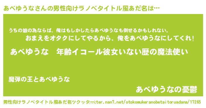 | 女子向けラノベタイトル風あだ名 | 『あべゆうなの玉の輿計画!』 |