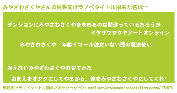 | 女子向けラノベタイトル風あだ名 | 『みやざわさくやの玉の輿計画!』 |