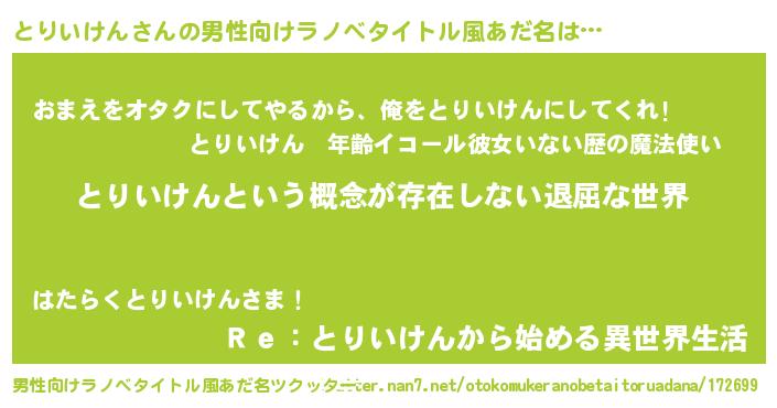 | 女子向けラノベタイトル風あだ名 | 『異世界で失敗しない100のとりいけん』 |