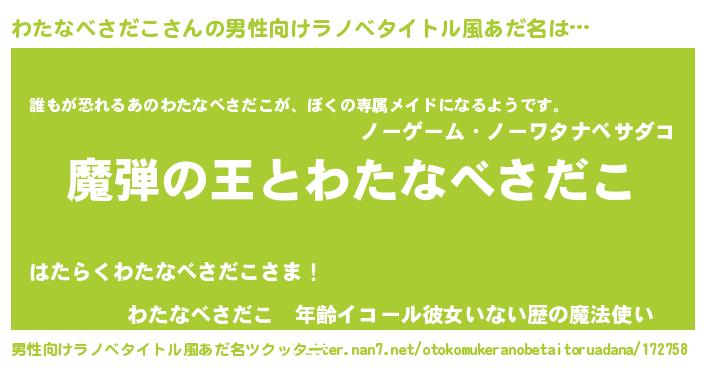 | 女子向けラノベタイトル風あだ名 | 『乙女ゲームの破滅フラグしかない悪役わたなべさだこに転生してしまった…』 |