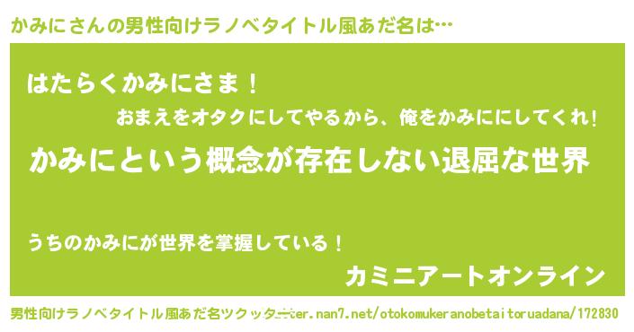 | 胡散臭い通販商品みたいなあだ名 | 『絶対に幸福をもたらす水素水…その名も「かみに」』 |