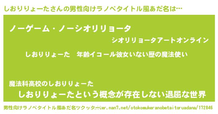 | 伝説のあだ名 | 『救世主となる錬金術士しおりりょーた』 |