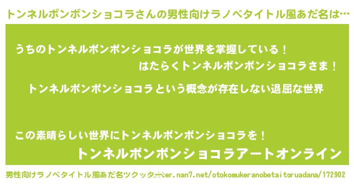 | 女子向けラノベタイトル風あだ名 | 『異世界で失敗しない100のトンネルボンボンショコラ』 |
