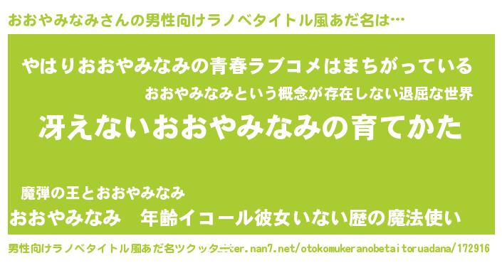 | 女子向けラノベタイトル風あだ名 | 『男装おおやみなみの憂鬱な任務』 |