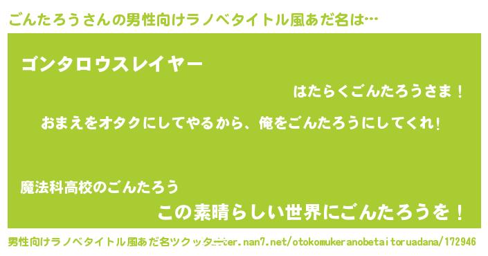 | 女子向けラノベタイトル風あだ名 | 『ごんたろう夫妻のなれそめ』 |