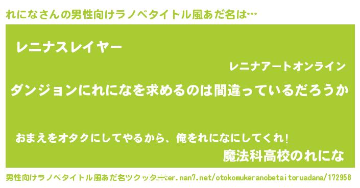 | 胡散臭い通販商品みたいなあだ名 | 『信頼と実績のサプリメント…その名も「れにな」』 |