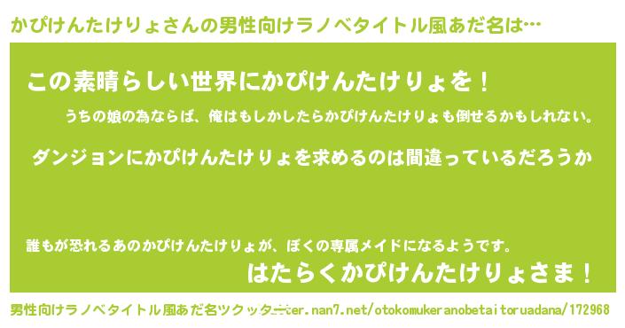 | 女子向けラノベタイトル風あだ名 | 『かぴけんたけりょは平凡を望む』 |