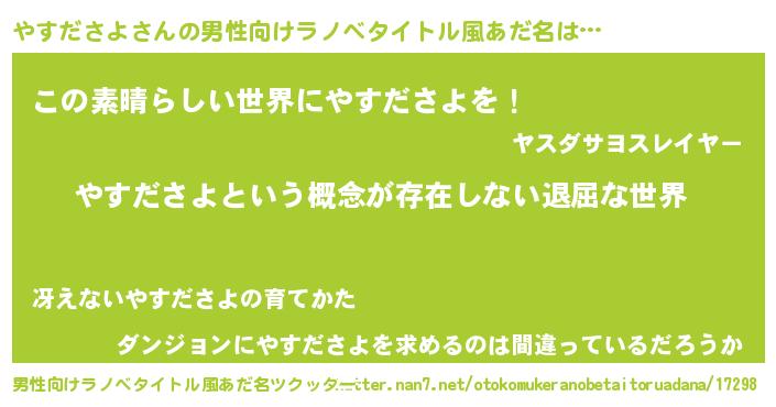 | 女子向けラノベタイトル風あだ名 | 『異世界で失敗しない100のやすださよ』 |