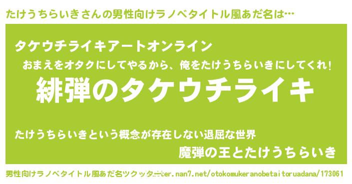 | ヘコむあだ名 | 『たけもー』『たけうちらいき(笑)』 |