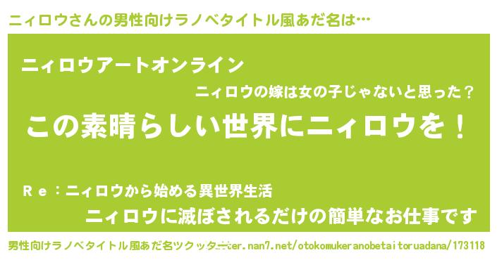 | 胡散臭い通販商品みたいなあだ名 | 『あなたにだけ特別に提供する世界で10本だけ現存している希少なブランデー…その名も「ニィロウ」』 |