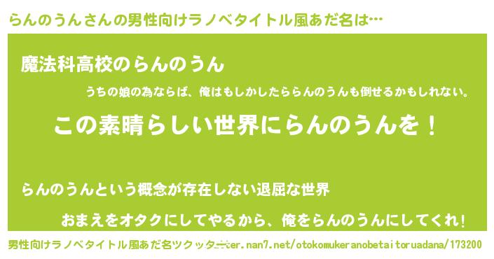 | 胡散臭い通販商品みたいなあだ名 | 『あなたにだけ特別に提供する100年もののヴィンテージワイン…その名も「らんのうん」』 |