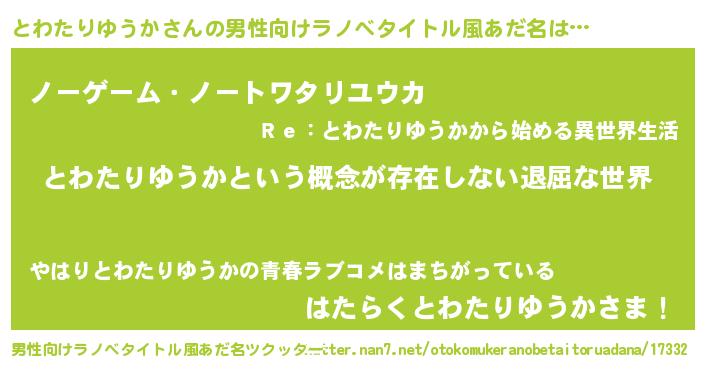 | ヘコむあだ名 | 『とわたりゆうか(笑)』『酢こんぶ』 |