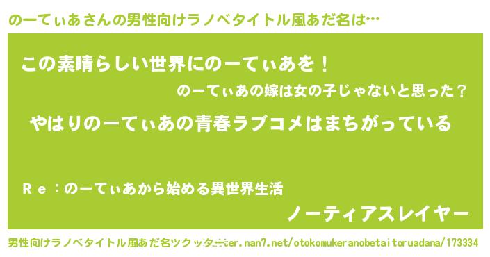 | 女子向けラノベタイトル風あだ名 | 『のーてぃあ伯爵の花嫁』 |