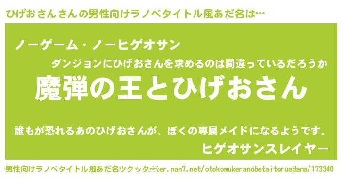 | 女子向けラノベタイトル風あだ名 | 『ひげおさんが死なない童話 林檎のひげおさんの診療簿』 |