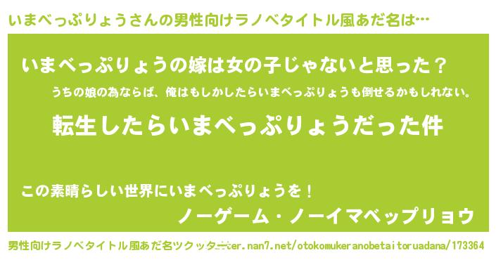 | 女子向けラノベタイトル風あだ名 | 『いまべっぷりょうの玉の輿計画!』 |