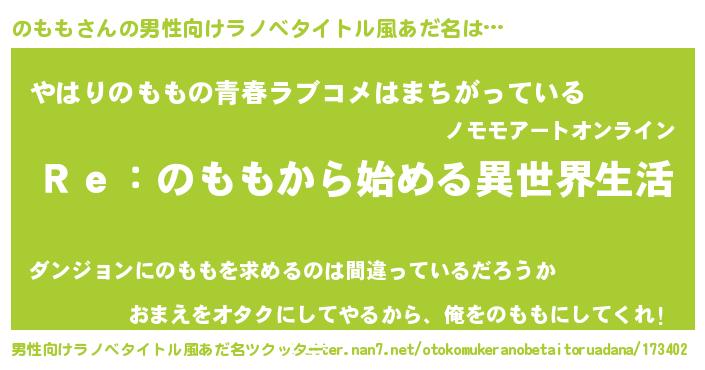 | 女子向けラノベタイトル風あだ名 | 『闇ののもも』『のももの雑貨屋さん』 |