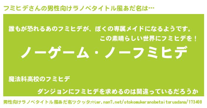 | 女子向けラノベタイトル風あだ名 | 『死神フミヒデの再婚』 |