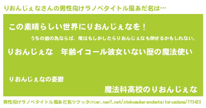 | 女子向けラノベタイトル風あだ名 | 『りおんじぇなの玉の輿計画!』 |