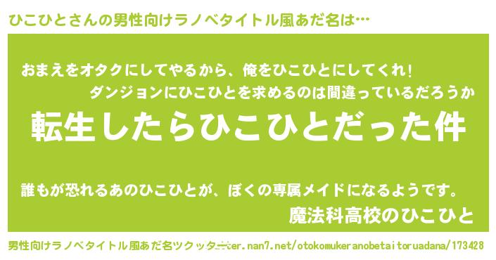 | 女子向けラノベタイトル風あだ名 | 『ひこひとの玉の輿計画!』 |